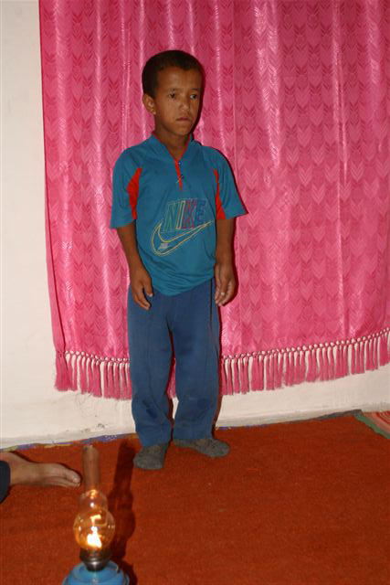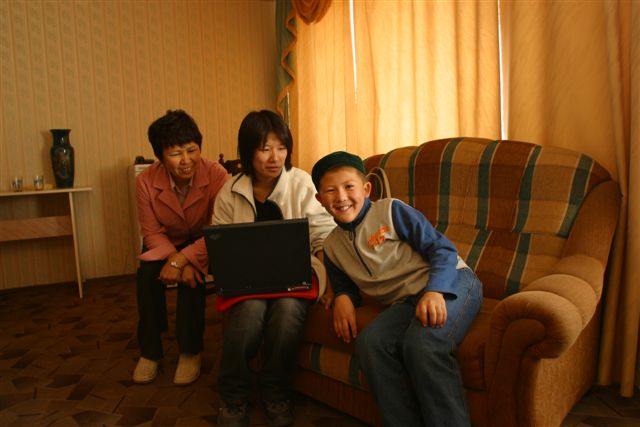 マラートさんの家はすっかりリニューアルしてきれいになっていた。自宅の畑 で取れたトマトや、豆などで奥さんの心づくしの手料理をご馳走になった。 9時過ぎにホテルに戻ると、アキンバイさんが奥さんと末っ子のオルジャスくん を伴って来てくれた。
