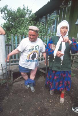 グスマンさんの父親は警察官だった。グスマンさんが小さい頃テチャ川の土手に有刺鉄線が張り巡らされ、村の人たちが入れないようになった。理由は知らされなかった。警察官の父親は土手に立ちその警備に当たっていた。父親は9人の子どもたちを残して44歳で亡なくなっった。村で初めての白血病だった。このとき、警備していた警察官たちは全員ガンで亡くなったという。 「どこからきた、ジャーナリストか?ワシの体を写真に撮ってくれ、モスクワのエリツィンに見せてやってくれ」と言うなり、ズボンを脱いだグスマノフ・ワフィルさん(77歳)の両足は慢性の関節痛と度重なる骨折で膝から内側に曲がっていた。57年から61年まで汚染されたスターレクルマノワ村の汚染除去作業に当たっていた。トラクターの運転手でテチャ川を1日に4回渡ったという。74年ころ、重いものを持ち上げようとしたときに骨折してしまったと。歯も抜け、慢性的な関節痛で悩まされている。医師は原因が分からないと言うがグスマノフさんは「マヤークの出した放射能のせいだ」という。タタール人のグスマノフ・ワフィルさんは「下流の村はとっくの昔に引っ越したのに上流のムスリューモバ村だけが取り残された。住民は毎年、定期的に血液を採られたり,検査を受けさせられる。まるで人体実験されているようだ」という。