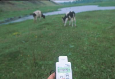 テチャ川の土手に立つと有刺鉄線が所々破れ、そこから入り込んだ牛がのんびりと草を食べ、アヒルの親子が流れの緩やかなところで泳いでいる。錆びた鉄製のプレートにやっと判読できる放射能のマークが書かれてあった。ここが今も汚染地帯であることを示す唯一の印だ。持って行った放射線計測器は東京の百倍近くあった。